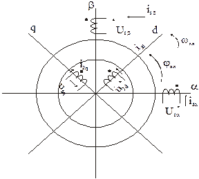 Схему обобщенной двухполюсной машины можно представить так, как изображено на рис. На 2-х взаимно перпендикулярных осях a и b, жестко скрепленных со статором, расположены две обмотки статора. На 2-х взаимно перпендикулярных осях d и q, жестко скрепленных с ротором, расположены две обмотки ротора. Они вращаются в пространстве вместе с ротором с угловой скоростью wЭЛ. Процессы проходящие в машине, описываются уравнениями равновесия ЭДС в цепях статора и ротора и уравнением электромагнитного момента.