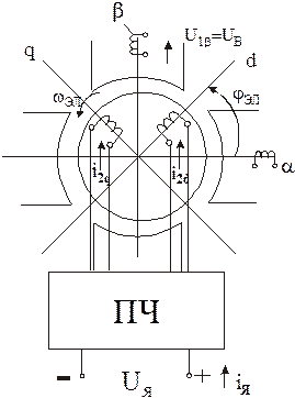 Модели ДНВ соответствует включение обмоток двухфазной обобщенной машины по приведенной ниже схеме. Здесь обмотка статора по оси b включена на постоянное напряжение UВ, а обмотка по оси a не используется. Обмотки фаз 2d и 2q ротора питаются переменными токами i2d и i2q от преобразователя частоты ПЧ, осуществляющего коммутацию этих токов(преобразование из постоянного) в функции угла от поворота ротора jэл с частотой wэл.