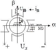Это значит, что в осях a, b действительным переменным токам обмоток ротора эквивалентна одна якорная обмотка, расположенная по оси a, обтекаемая постоянным током iя, которая создает магнитное поле, неподвижное в пространстве и направленное по оси a, совпадающей с осью щеток двигателя. По оси b обмотки ротора нет, о чем говорит то, что ток в такой обмотке равен 0.