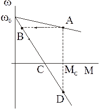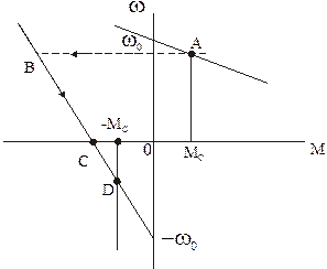 При изменении полярности напряжения на якоре, двигатель, работавший до этого со скоростью соответствующей т. А, переходит в т. В для работы на искусственной характеристике и тормозится на ее участке ВС. При w=0 двигатель должен быть отключен от сети. Если требуется реверс и если момент двигателя в т. С больше МС, знак которого скачком изменится на противоположный, произойдет изменение направления вращения и разгон двигателя до т. Д, где момент двигателя станет равным МС. Ток, в двигателе в этом тормозном режиме определяется зависимостью: