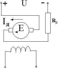 т.е. станет значительно больше, чем в двигательном режиме. Возрастет и величина момента двигателя, который по отношению к вращающемуся в противоположном направлении якорю является тормозным. Для ограничения тока и момента значениями, допустимыми по условиям коммутации, в цепь якоря должно быть включено добавочное сопротивление RД, равное примерно 2-х кратному пусковому.