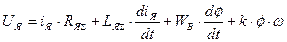 У двигателя последовательного возбуждения обмотка возбуждения включена последовательно с обмоткой якоря и его поток Ф является функцией тока якоря, т.е. зависит от нагрузки машины. Принципиальная схема ДПВ изображена на рис., а схема двухфазной модели ЭМП двигателя последовательного возбуждения может быть получена аналогично схеме модели ЭМП ДНВ при включении обмотки возбуждения последовательно в цепь якоря (см. рис. ниже). При быстрых изменениях нагрузки, следовательно быстрых изменениях Ф, анализ динамических свойств двигателя без учета влияния вихревых токов, наводимых в сердечниках полюсов и станине, может привести к значительным ошибкам. Влияние этих токов может быть учтено добавлением к.з. обмотки на оси b, связанной с потоком Ф машины по этой оси коэффициентом связи, равным 1. С учетом этой фиктивной обмотки математическое описание процессов преобразования энергии в ДПВ имеет вид:
