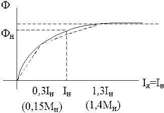 Отсюда следует, что при малых нагрузках механическая характеристика ДПВ имеет гиперболический характер. Второй участок линейной аппроксимации кривой намагничивания соответствует значениям IЯ до 1,3IН и М до 1,4МН. Для этого участка справедливы соотношения для потока при выражении через ток
