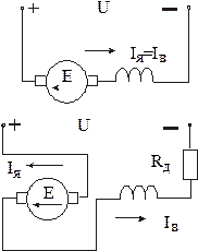 При идеальном холостом ходе скорость двигателя теоретически может возрасти до бесконечности. В действительности всегда имеет место трение в подшипниках, о воздух и т.п. и есть поток остаточной индукции, составляющей (0,02¸0,09)ФН. Поэтому скорость не возрастает до бесконечности, но может в 5¸7 раз превышать номинальную. Однако во избежание опасности разноса двигателя его с приводным механизмом нельзя соединять при помощи ременной и цепной передачи. Реверсирование ДПВ осуществляется путем изменения направления тока в якоре.Схема предшествующая реверсу, и схема реверса изображены на соответствующих рис. Для ограничения первоначального броска тока в якорную цепь должно быть введено добавочное сопротивление.
