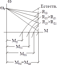 , максимум критического момента смещается в сторону больших скольжений, а величина его не меняется, т.к. он не зависит от активного сопротивления роторной цепи. Введение в цепь ротора добавочного активного сопротивления используется для ограничения пускового тока и увеличения пускового момента. Можно ввести такое Rдаб, при котором критическое скольжение окажется равным 1, а пусковой момент двигателя равным критическому. Физически увеличение пускового момента объясняется увеличением активной составляющей тока ротора (увеличением числа проводников обмотки ротора, на которые электромагнитные силы действуют по направлению вращения и уменьшением числа проводников, на которые электромагнитные силы действуют против направления вращения). Семейство механических характеристик двигателя, соответствующих разным по величине Rдаб , введенным в цепь ротора, изображено на рисунке.