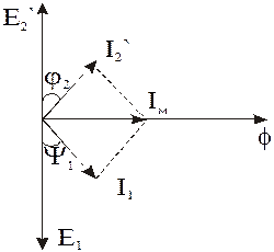 . Этот же поток наводит в обмотке ротора, вращающегося со скоростью, превышающей скорость вращения магнитного потока, ЭДС Е2, сдвинутую относительно Е1 на 180°. Ток статора I1 вследствие преобладания емкости, опережает Е1 на угол j1, а ток ротора I2’ из-за наличия индуктивного сопротивления, отстает от Е2 на угол j2, что отражено на векторной диаграмме.