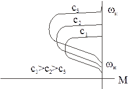 Механические характеристики асинхронной машины в режиме торможения с самовозбуждением для различных значений емкости приведены на рисунке. Максимум тормозного момента при уменьшении емкости перемещается в область более высоких скоростей, причем он может в 5-8 раз превышать номинальный момент двигателя.