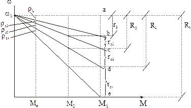 Полученное выражение показывает, что сопротивление на любой характеристике можно найти умножением скольжения на этой характеристике на r2Н. Отсчитывая при МН скольжения между смежными характеристиками, получим доли сопротивления ρД и ρД2 и т.д., по которым умножением на r2Н находятся абсолютные величины сопротивления ступеней. Отсчитывая же полные скольжения при МН для искусственных характеристик, получим соответствующие полные сопротивления R1, R2…, т.е.