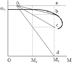 При учете криволинейности механических характеристик рассчитывается и строится естественная механическая характеристика. Задаются значениями М1 и М2. Через точки пересечений вертикалей, соответствующих М1 и М2 с естественной характеристикой проводится луч до пересечения с горизонтальной линией, соответствующей ω=ω0 (S=0) в т.0’.