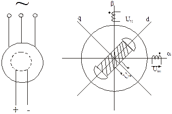 Принципиальная схема и схема двухфазной модели СД изображены на следующих рисунках. Обмотки фаз ее статора питаются симметричной двухфазной системой напряжений.