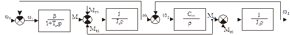 Приведенные уравнения и эта схема справедливы для любого электропривода, уравнение механической характеристики которого в рассматриваемом процессе может быть с достаточной точностью представлено первым уравнением системы, а механическую часть удовлетворительно представляет 2 –х массовая расчетная схема. Особенности применяемого двигателя при этом отражаются в конкретных значениях переменных и выражениях параметров. Так, для ДВН