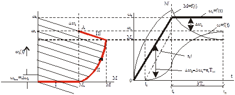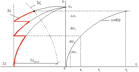Пусть кривая момента двигателя задана в виде ломанной линии (пуск в несколько ступеней), а кривая статического момента – в виде пунктирной кривой (см. график). Задаваясь