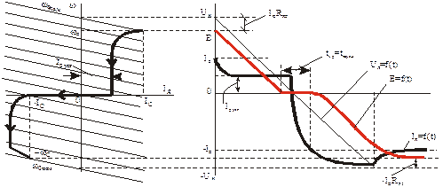 . Ток якоря при этом уменьшается от значения Ic до Iр.уст и затем остается неизменным до w=0. В момент перехода w через 0 Мс изменяет свой знак.