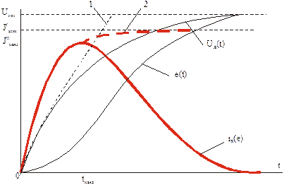 . Если бы UЯ нарастало по линейному закону, ток изменялся бы по закону экспоненты (кривая 2) с постоянной Тм, стремясь к значению Iмакс. Но поскольку темп нарастания UЯ в действительности уменьшается, ток, достигнув значения I``макс при t=tмакс, начнет уменьшаться по закону близкому к закону, определяющему темп изменения напряжения