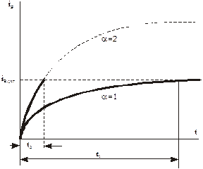 ; При a=2 t2=0,14t1, т.е. процесс нарастания тока возбуждения увеличивается ~ в семь раз. Форсирование возбуждения не только сокращает длительность переходного процесса, но и улучшает его качество, т.к. нарастание iв и, следовательно, ЭДС и напряжения генератора становится более равномерным.