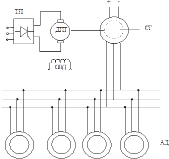 Схема регулирования скорости СГ, а следовательно, и частоты, по системе ТП-Д проще и дешевле, чем по системе ГД, т.к. в этом случае меньше число ступеней преобразования энергии. В качестве примера на рис. изображена схема одновременного частотного регулирования ряда АД, которые получают питание от СГ, скорость которого, следовательно, частота выходного напряжения, регулируется по системе ТП-Д.Такая схема применяется, в тех случаях, когда требуется одновременно синхронно изменять скорость ряда к.з. АД, в частотности, для питания двигателей рольгангов прокатного стана. В этой схеме обеспечивается закон пропорционального регулирования, т.е.