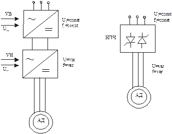 Более совершенными являются системы со статическими преобразователями частоты. В этих системах в самом преобразователе только две ступени преобразования энергии – ступень преобразования переменного тока в постоянный и ступень инвертирования. Эти две ступени в самостоятельном виде присутствуют в ПЧ со звеном постоянного тока (см.рис.), а в НПЧ функции выпрямления и инвертирования совмещены в реверсивном преобразователе постоянного тока, выпрямленное напряжение которого изменяется системой управления. Принципиальная схема привода с НПЧ изображена на рис.Как известно,
