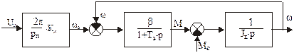 Дополнив эти уравнения уравнением движения электропривода при жестких механических связях, получим структурную схему системы ПЧ-АД, которая изображена на рис.