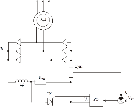 Выходное напряжение Uу релейного элемента РЭ определяет открытое или закрытое состояние тиристорного ключа ТК. На вход РЭ подается сигнал, пропорциональный разности задающего напряжения Uзт и напряжения обратной связи по току Uо.т. При достаточно большой частоте fк коммутации ТК можно считать, что в цепь выпрямленного тока ротора введено регулируемое “импульсное” добавочное сопротивление Rдоб. имп., величина которого плавно изменяется от 0 до Rдоб. При изменении скважности импульсов