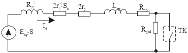 Когда ТК открыт (g=1), Rдоб. шунтировано. В этом случае момент, развиваемый двигателем, определяется его естественной характеристикой. Когда ТК закрыт (g=0), в цепь ротора введено Rдоб., что соответствует работе двигателя на реостатной характеристике. Изменяя соотношение между интервалами времени, в течение которых ТК открыт или закрыт, можно регулировать выпрямленный ток ротора, а следовательно, плавно регулировать развиваемый двигателем момент М. Для получения выражения момента и уравнения механической характеристики двигателя при данном способе регулирования момента, воспользуемся схемой замещения, в которой параметры статора приведены к цепи выпрямленного тока ротора. Здесь