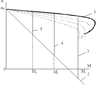 Отсюда следует, что при Idcp=const момент, развиваемый АД в статическом режиме, остается постоянным. Т.о.,поддерживая постоянным среднее значение выпрямленного тока на различных уровнях, можно регулировать момент M двигателя с высокой точностью. Так, поддерживая выпрямленный ток на уровнях Id1, Id2, Id3 постоянным, можно получить характеристики электропривода, обеспечивающие постоянство момента (прямые 3,4,5; достигается это путем задания Uзт=const) в пределах изменения w от характеристики 1 до характеристики 2.