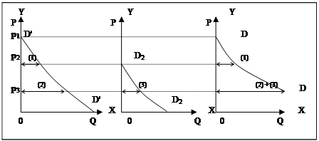 Наряду с понятием индивидуального объема спроса существует понятие рыночного или суммарного объема спроса, под которым понимается сумма величин спроса отдельных потребителей при данной цене. Практически рыночный объем спроса выявляется на основе сбора статистических данных относительно различных потребителей и их групп. Геометрически кривую рыночного спроса можно получить на основе сложения индивидуальных кривых спроса по горизонтали.*