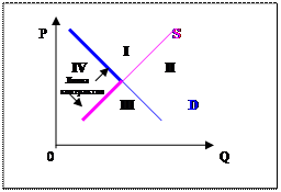Представим ограниченное осями координат пространство в виде поля для рыночного обмена. В этом случае линии спроса и предложения поделят его на четыре зоны экономической активности (рис.17). В зоне I цена предложения превышает цену спроса при любом объеме. Поэтому если в этой зоне и возможны рыночные сделки, то они будут носить случайный характер. Зона II представляет собой «мертвую зону», так как взаимодействия продавцов и покупателей здесь в принципе возникнуть не может — все возможные цены выше цен спроса и ниже цен предложения. В зоне III возможны покупки, но невозможны продажи, так как цены не обеспечивают возмещения производственных затрат. И только в зоне IV возможно устойчивое осуществление рыночных операций. При этом линия контрактов показывает все возможные пары «цена—количество» для данного уровня спроса и предложения.