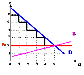 Представим рыночный спрос в виде спроса отдельных потребителей (рис. 18). Субъективные оценки ценности блага у разных потребителей будут разными, а значит, разной будет и их готовность платить, или цена спроса. Первый потребитель готов заплатить за единицу блага максимальную цену в размере шести долларов, второй — пяти, третий — четырех, четвертый — трех, а пятый — двух долларов. В данном примере только денежная оценка пятого покупателя совпадает с равновесной рыночной ценой блага (Pe). В действительности все потребители будут покупать благо по одной и той же рыночной цене, равной 2 долларам.