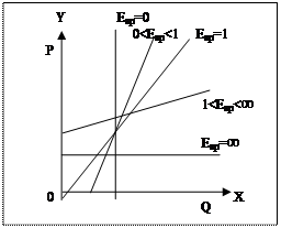 Как и в случае с эластичностью спроса по цене, можно выделить пять вариантов или моделей эластичности предложения по цене: эластичное предложение (1<ESp< ¥); неэластичное предложение (0<ESp<1); предложение с единичной эластичностью (ESp=1); абсолютно эластичное предложение