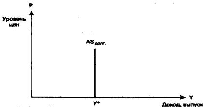 Кривая AS вертикальна. Она характеризует естественный (потенциальный) уровень объема производства, т. е. объема производства в условиях полной занятости, при котором ресурсы экономики полностью используются, а безработица находится на естественном уровне.