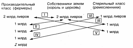 3.«бесплодный» класс на полученный миллиард покупает у фермеров продукты питания. Фермеры получают ещё один миллиард, и ещё одна пятая часть годового продукта выводится из обращения;