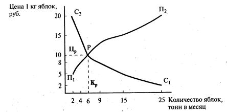 Если из точки Р опустить перпендикуляр на ось абсцисс, то в точке Кр определим равновесное количество. Оно показывает величину товарной массы (в данном случае количество яблок), которая удовлетворяет пожелание покупателей и продавцов.