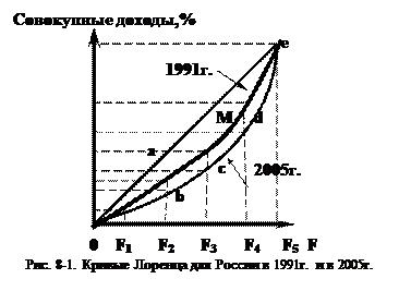 Коэффициент Джини рассчитывается на основе методики кривой Лоренца как отношение области М к площади треугольника O e F5. Его значение находится в пределах от 0 до 1. Чем больше значение коэффициента, тем больше степень неравенства.