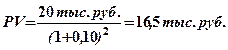 Покажем это на примере. Вам предлагают вложить 17 тыс. руб. в проект, который через 2 года даст 20 тыс. руб. дохода. Предположим, что процентная ставка стабильная и составляет 10% годовых. Выгодно ли инвестирование? Используем метод дисконтирования, т.е. приводим (дисконтируем) будущую стоимость к настоящей: