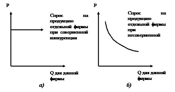 Если товаропроизводитель продает товаров столько, сколько он хочет и может продать, а рыночная цена остается неизменной, то на рынке имеет место совершенная конкуренция (а), а сам товаропроизводитель является совершенным конкурентом. Если же фирма увеличивает количество товаров, поставляемых на рынок, и цена падает, то на рынке имеет место несовершенная конкуренция (б).