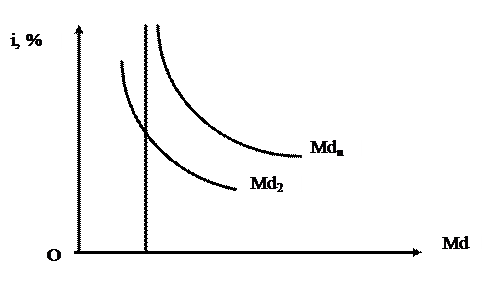 Трансакционный спрос на деньги отражает прямая Md1, параллельная оси ординат, т.е. трансакционный спрос не зависит от процентной ставки.
