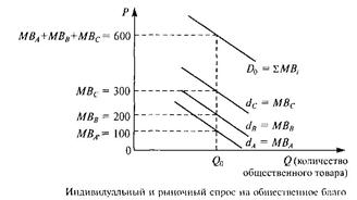 Спрос на общественные блага определяется путем суммирования спроса индивидуальных потребителей. При этом спрос каждого индивидуального потребителя на каждую конкретную единицу общественного блага зависит от предельной выгоды (MB), которую он получает от дополнительной единицы общественного товара. Согласно закону убывающей предельной полезности, предельная выгода является величиной убывающей, т. с. каждую следующую единицу общественного товара потребитель оценивает ниже предыдущей. Для того чтобы получить кривую коллективного спроса ив общественный товар, мы должны просуммировать кривые индивидуального спроса всех его потребителей или просуммировать графики получаемых ими предельных выгод (MB). Кривая коллективного спроса на общественные блага будет схожа с кривой рыночного спроса на частные блага.