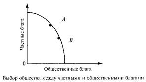 На кривой производственных возможностей (КПВ), таким образом, общество выбирает между частными благами и общественными товарами (см. рис. ниже). Так, точка А отражает определенную комбинацию производства частных и общественных благ. При увеличении количества производимых общественных товаров выбор общества будет смещаться вниз по КПВ, допустим до точки В, сокращая объемы выпуска частных благ, а высвободившиеся при этом ресурсы направляя на производство благ общественных.