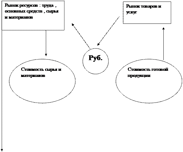 1. Схему финансово-хозяйственной деятельности предприятия и этапы цикла производства и реализации продукции можно проиллюстрировать с помощью наглядно-образной модели (рис. 1): 1) первоначальный капитал в денежной форме обменивается на рынке ресурсов на труд, основные средства, сырьё и материалы; 2) в процессе производства образуется производственная стоимость капитала; 3) на третьем этапе формируется стоимость готовой продукции, которая затем 4) на рынке товаров и услуг обретает денежную форму.