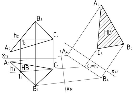 1) Заданный треугольник спроецируется в прямую линию, если новая плоскость проекций окажется перпендикулярной к плоскости этого треугольника. Или – к какой-либо прямой его плоскости. Практически – роль такого ориентира может играть линия уровня в плоскости треугольника. В данном случае – это горизонталь