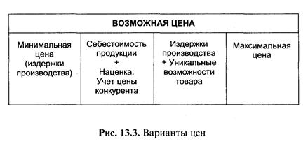 В конечном итоге уровень устанавливаемой цены по здравому смыслу должен находиться где-то в промежутке между низкой ценой (издержки производства), не приносящей прибыли, и теоретически высокой ценой, определяемой спросом (рыночная цена) без учета задач предприятия (рис. 13.3).