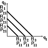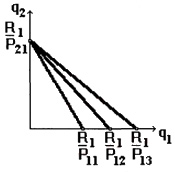 Изменение цены на один из товаров при неизменном доходе и цене другого товара изменит наклон бюджетной линии, равный отношению цен. Так, например, при сокращении цены P1 на товар Q1 максимальное количество товара, приобретаемое при данном доходе, увеличивается с R/P11 до R/P12. Соответственно уменьшается угол наклона бюджетной линии