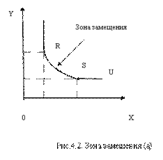 На кривой безразличия зона замещения обозначена отрезком RS (рис.4.2а). Взаимная замена благ Х и Y имеет смысл только в пределах отрезка RS. Вне отрезка замена исключается. Два блага выступают как независимые друг от друга.