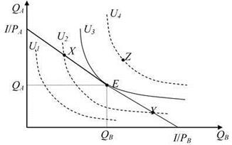 Точка Е на рис. 2.9 показывает оптимальную для потребителя комбинацию благ (QA, QB), приносящую максимальную полезность. Точки Х и Y, лежащие на той же бюджетной линии, что и точка Е, находятся на более низкой кривой безразличия U2. Это означает, что наборы благ Х и Y стoят столько же, сколько и набор Е, но при этом приносят потребителю меньшую полезность. Набор Z лежит на более высокой кривой безразличия, чем набор Е, т.е. имеет бoльшую полезность, однако он недоступен потребителю: бюджетная линия проходит ниже и не касается кривой безразличия U4.