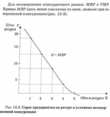 При прочих неизменных условиях предприятие в условиях несовершенной конкуренции будет производить меньше продукта, нежели в условиях совершенной. Объясняется такое поведение предприятия тем, что ограничения объемов выпуска компенсируются ему ростом цен. Конечно же, для производства меньшего объема выпуска предприятию понадобится и меньше ресурсов, т. е. для несовершенной конкуренции VMP > MRP.