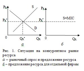 Последняя определяется взаимодействием общего спроса и предложения на ресурсном рынке (рис. 1а). Отдельная фирма – покупатель ресурса – принимает эту цену как данную. По ней она может купить любое количество ресурса. Кривая предложения ресурса для конкурентной фирмы, следовательно, горизонтальна (рис.1 б).