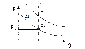 Линия спроса на землю D имеет отрицательный наклон. Линия предложения вертикальна оси ОХ, неэластична и постоянна. Точка Е – точка равновесия на рынке земли. Ей соответствует равновесная цена земли R – это равновесная рента или арендная плата. Поэтому изменение спроса может увеличивать или уменьшать цену земли. Цена земли зависит от величины земельной ренты. Чем больше земельная рента, тем при прочих равных условиях увеличивается цена данного участка земли.