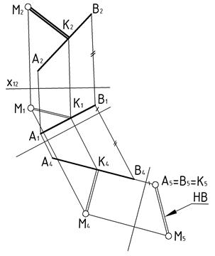 преобразовать в проецирующую прямую и использовать его вырожденную в точку проекцию. Для решения задачи потребуется две замены плоскостей проекций.