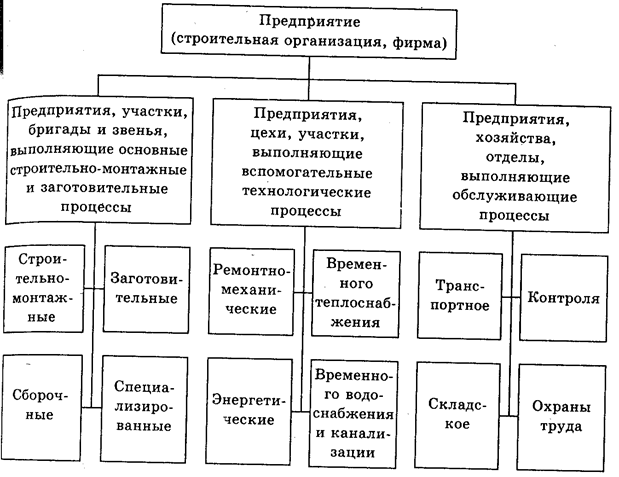 В строительстве различают основные, вспомогательные и обслуживающие сторонние предприятия, а также участки, цехи, хозяйства, отделы, входящие в состав строительного предприятия (организации, фирмы).