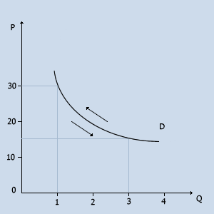 Рассмотрим ситуацию, складывающуюся на рынке какого-нибудь товара А. Предположим, что при цене $ 30 за одну условную единицу покупатель готов купить лишь 1 единицу блага А, при цене $ 15 - 3 единицы и т.д. Зависимость количества проданных благ от уровня цен может быть представлена графиком (рис. 2).